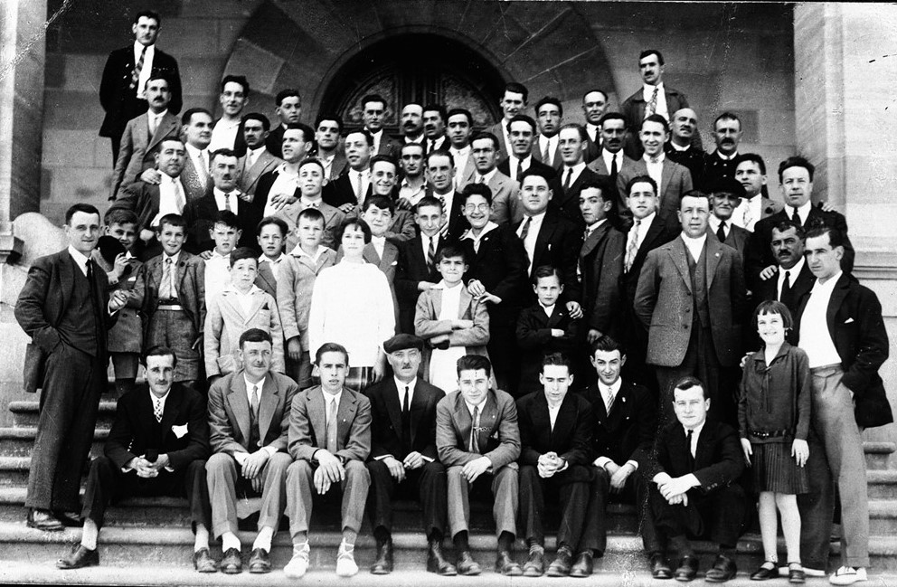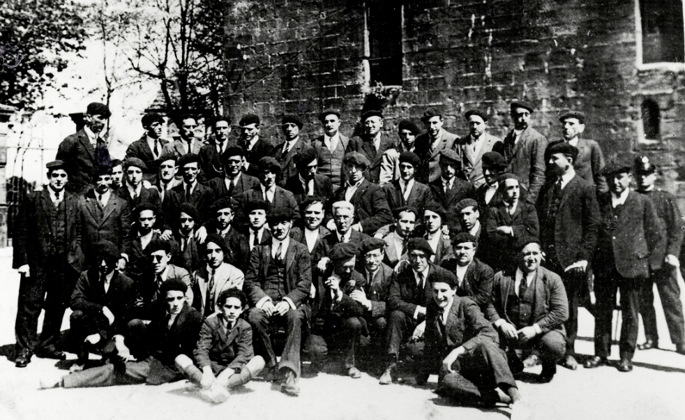 El Orfeón de la Irun’go Atsegiña posando en la entrada del colegio de El Pilar, en fotografía procedente del Archivo de Irún. José Larruquert está sentado en el centro, con bigote y boina. El tercero a su izquierda es su hijo Pedro y la joven de blanco casi detrás de José es su hija pequeña, Gloria. La fotografía puede ser de 1928, dada la presencia de niños en el orfeón.
