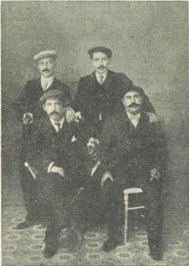 José Larruquert, de pie a la izquierda, junto con tres miembros de la banda de Pasajes Ancho, hacia 1905 o quizá 1906. Sentado a la derecha, Paco Sinisterra, a quien dedicó al menos un pasodoble. (Fuente: Los Tres Pasajes, No. 46, 1948. Procedencia: Biblioteca de Koldo Mitxelena Kulturunea-Diputación Foral de Gipuzkoa)