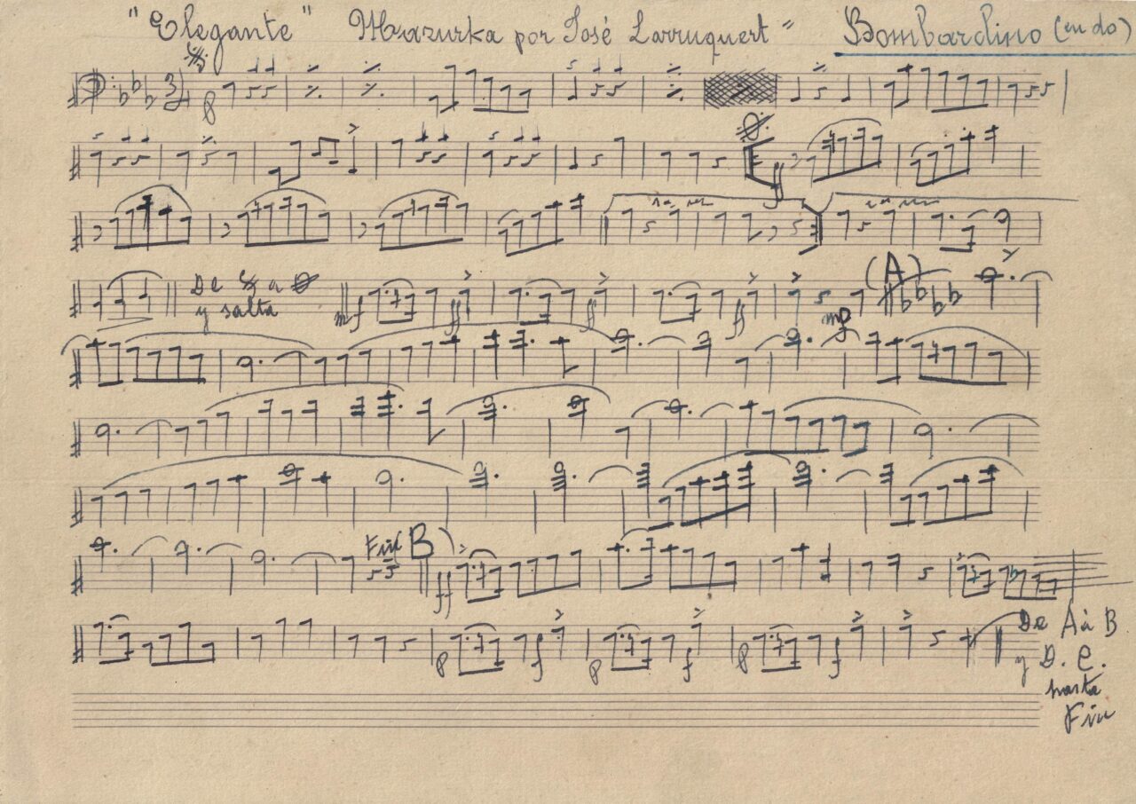 Presentada como mazurka de salón. Tiene un pasaje para bombardino solista. Existen unas cuantas obras con el nombre de mazurka Elegante, por lo que habría que investigar si se trata de algún sub-género. Fue interpretada por una sección de la Banda Municipal de Irún en 1956 (La Voz de España, 25-VII-1956).
