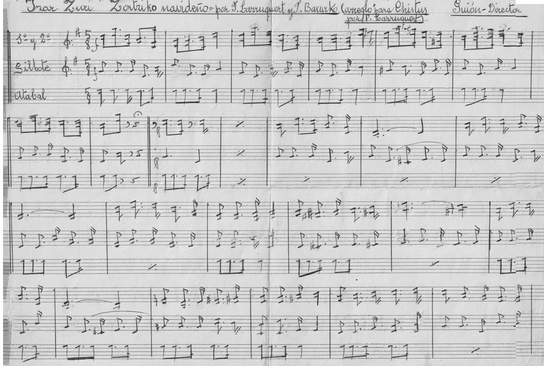 Entre la documentación de los descendientes de Pedro Larruquert encontramos este zortziko navideño de José Larruquert, adaptado por su hijo Pedro para banda de txistularis. El zortziko probablemente sea original para coro, dado que entre los autores se menciona también a J. (Juan) Baxurko; se trata del escritor en lengua vasca que puso letra a la mayoría de obras vocales tanto de José como de Pedro Larruquert, y de hecho a todas las localizadas hasta el presente.