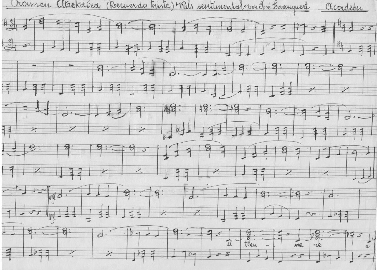 Este vals sentimental para acordeón reproduce la melodía de la obra para coro del mismo autor y del mismo título. Se ha localizado entre la documentación de los descendientes de Pedro Larruquert, el hijo del autor, y tiene la caligrafía de Pedro. La obra para coro se estrenó en 1923; en cambio, no sabemos de cuándo data esta versión para acordeón.